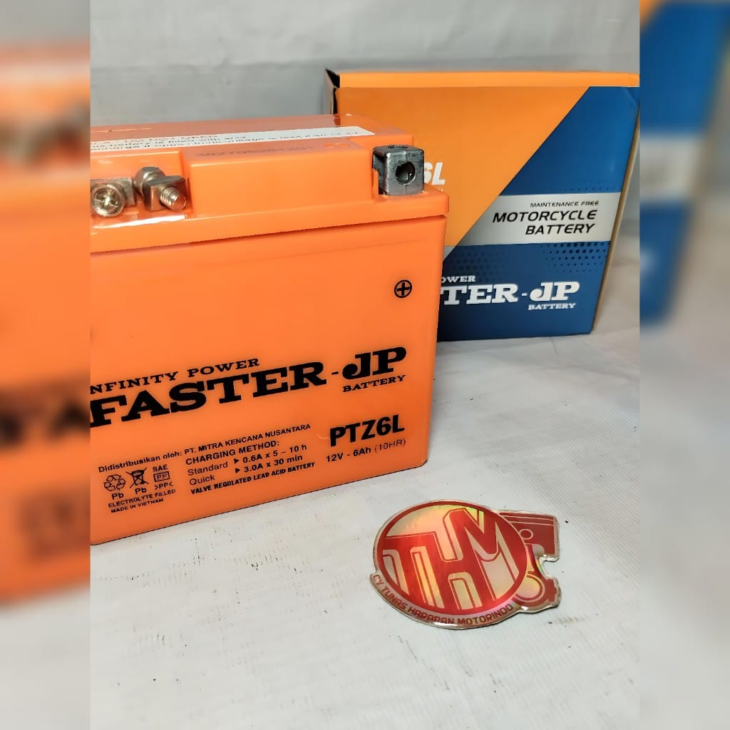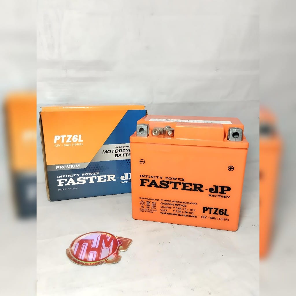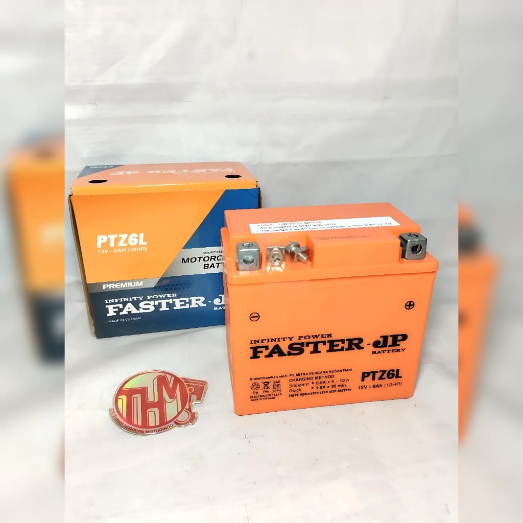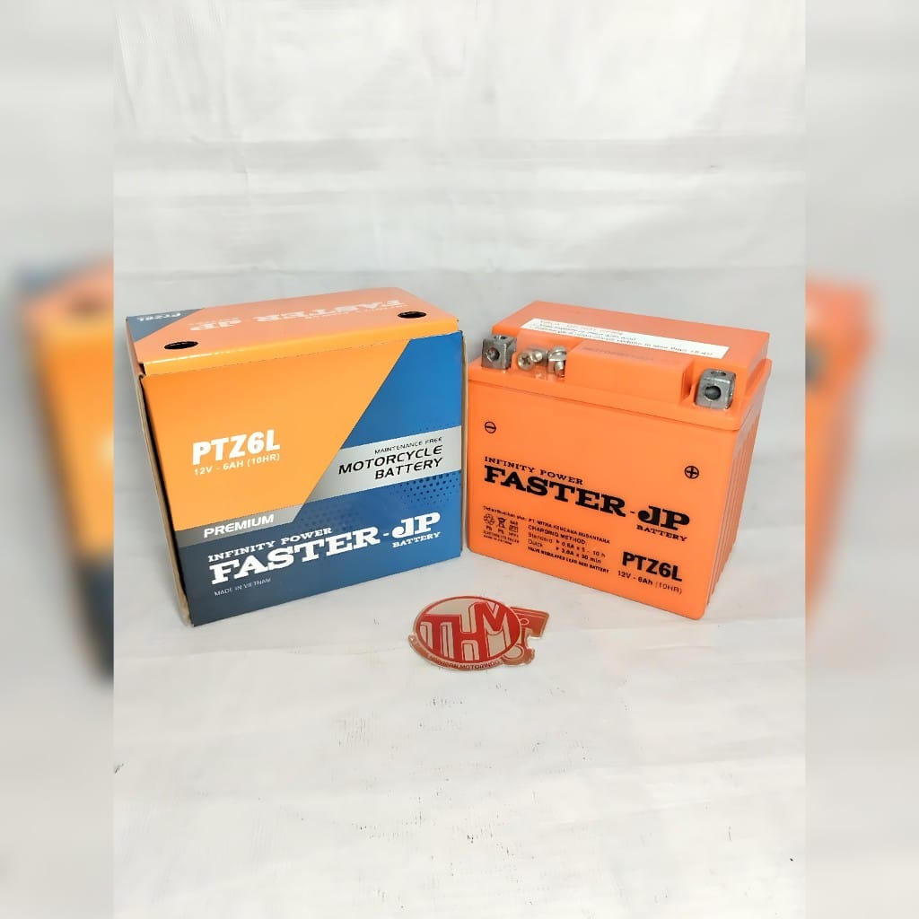 Aki motor Faster JP PTZ6L (12V 6Ah) adalah tipe kering maintenance-free (MF) yang dirancang untuk performa optimal, daya tahan tinggi, dan energi starter kuat. Aki ini cocok untuk berbagai motor matic/sport, termasuk Nmax, Aerox, Vario 125/150, dan Honda Beat ISS. Diproduksi di Vietnam, aki ini menawarkan kualitas OEM dengan plat lebih tebal dan tahan getaran.